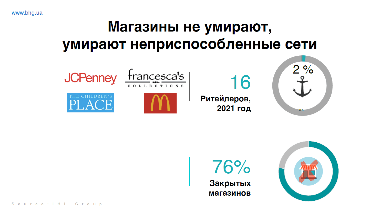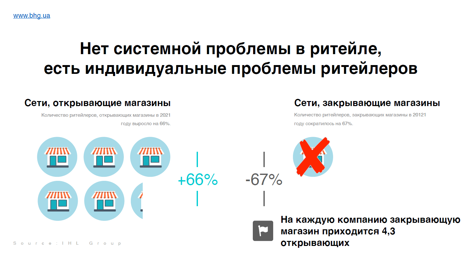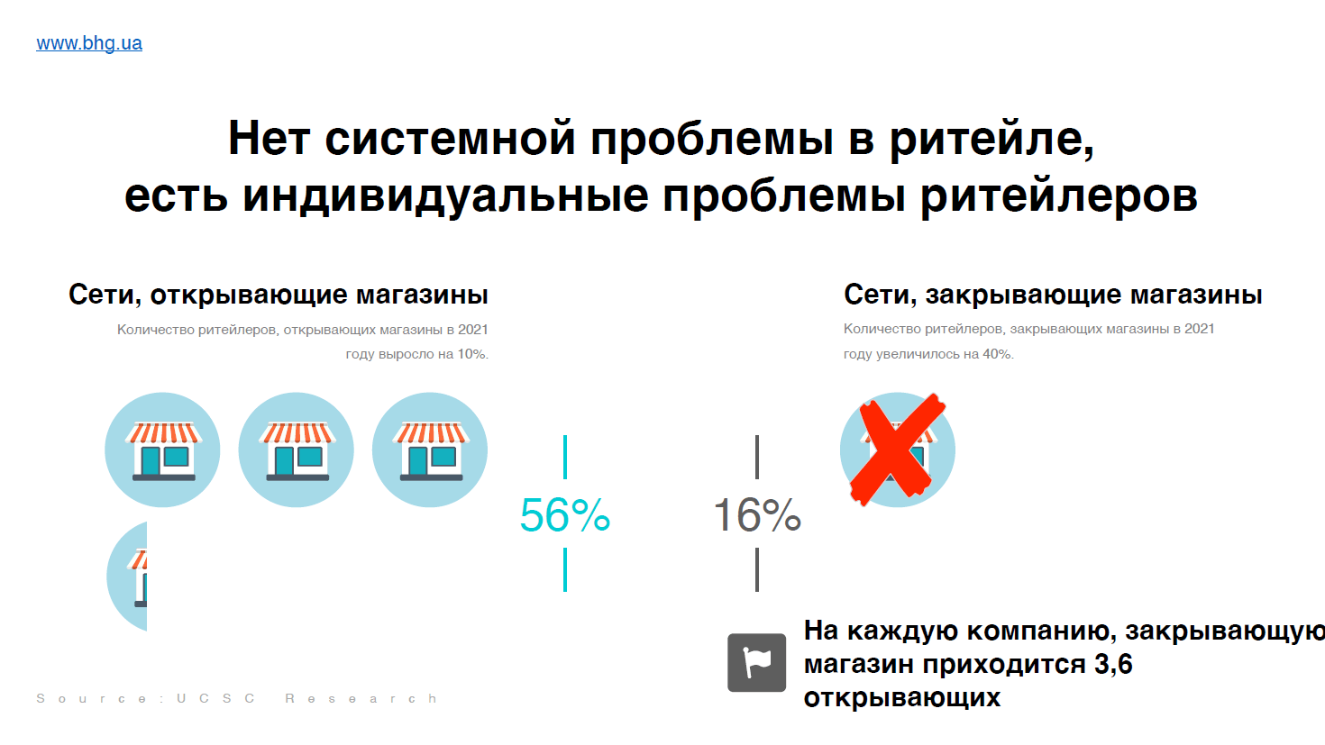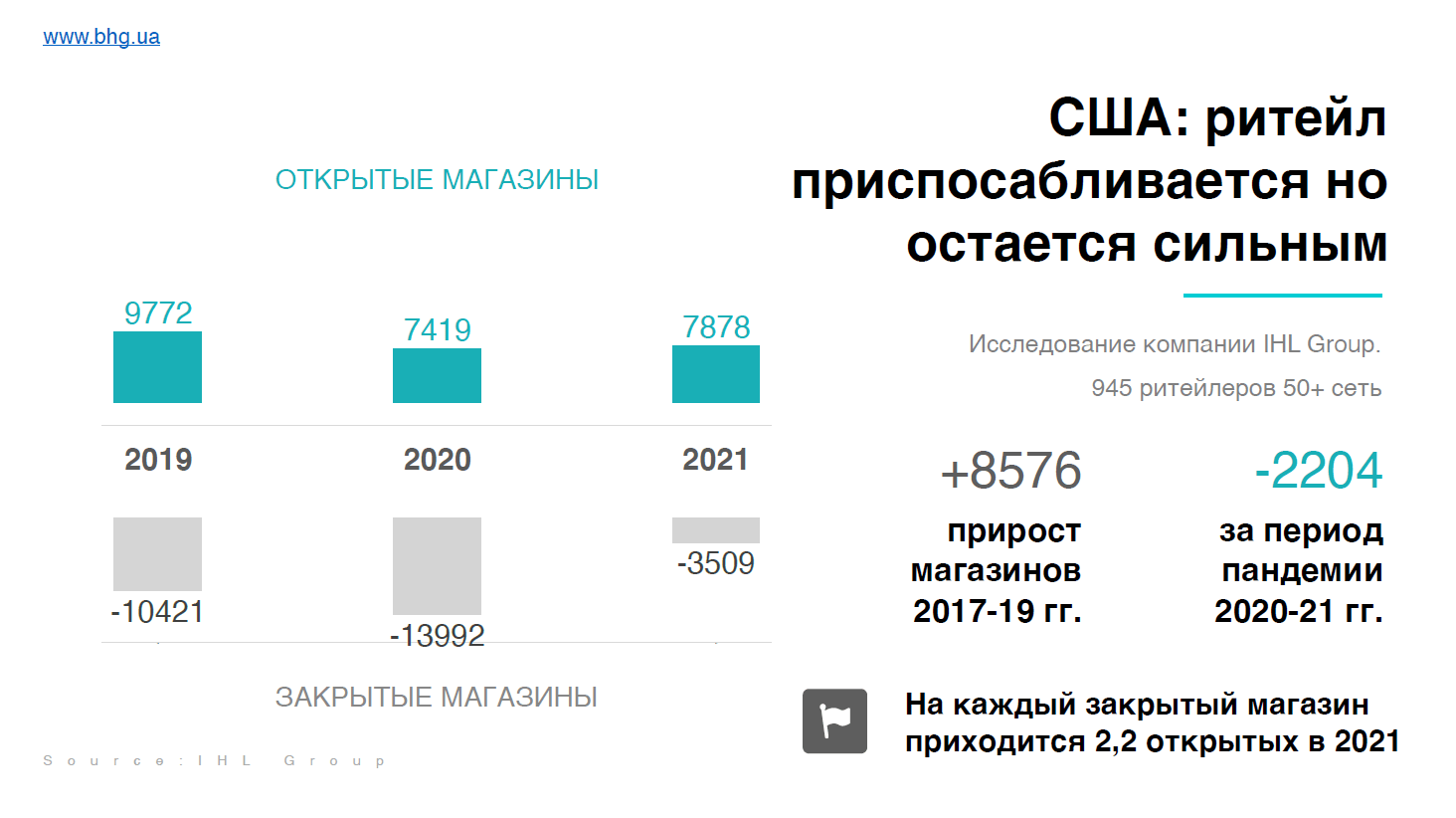 Щодо американського досвіду, у 2020 році кількість закритих магазинів у 2 рази перевищила кількість відкритих. Але вже 2021 року тенденція змінилася – більше фізичного ритейлу відкривалося, ніж закривалося. На один закритий магазин припало 2,2 відкритих.