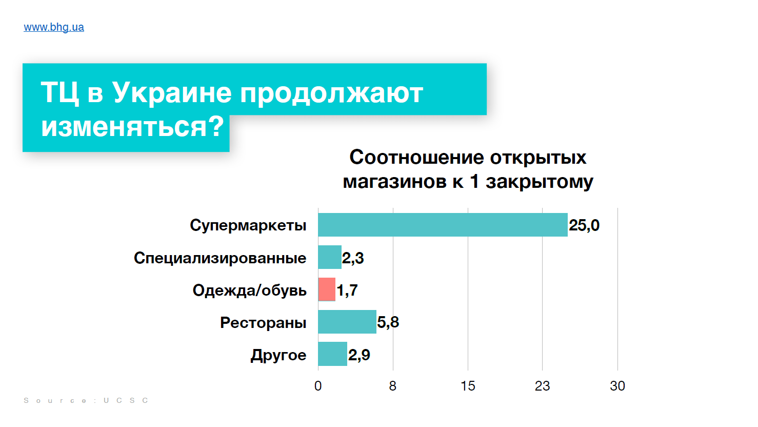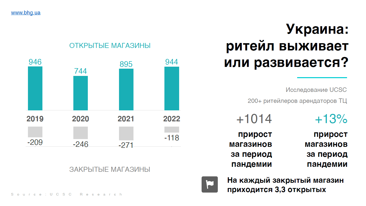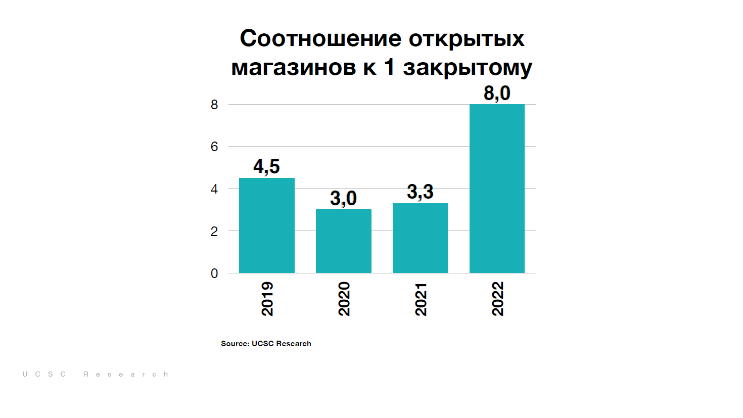 На 2022 рік у наших орендарів плани ще більш оптимістичні. Якщо за період пандемії на один закритий магазин припадало 3,3 відкриті, то наступного року українські ритейлери на один закритий магазин планують відкрити 8.