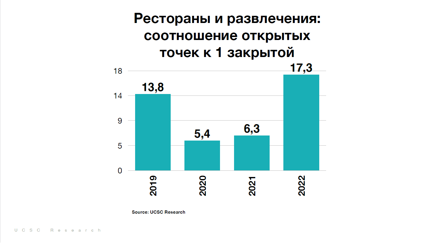 Як відомо, ресторанна галузь під час пандемії постраждала найбільше, проте динаміка розвитку цих мереж також позитивна. Навіть у період локдаунів на кожну закриту точку припадало 5 відкритих. Це навіть вище, ніж у середньому за ритейлерами. У 2022 році вони планують розвиватися ще активніше, і на кожну закриту точку планується 17 відкритих.