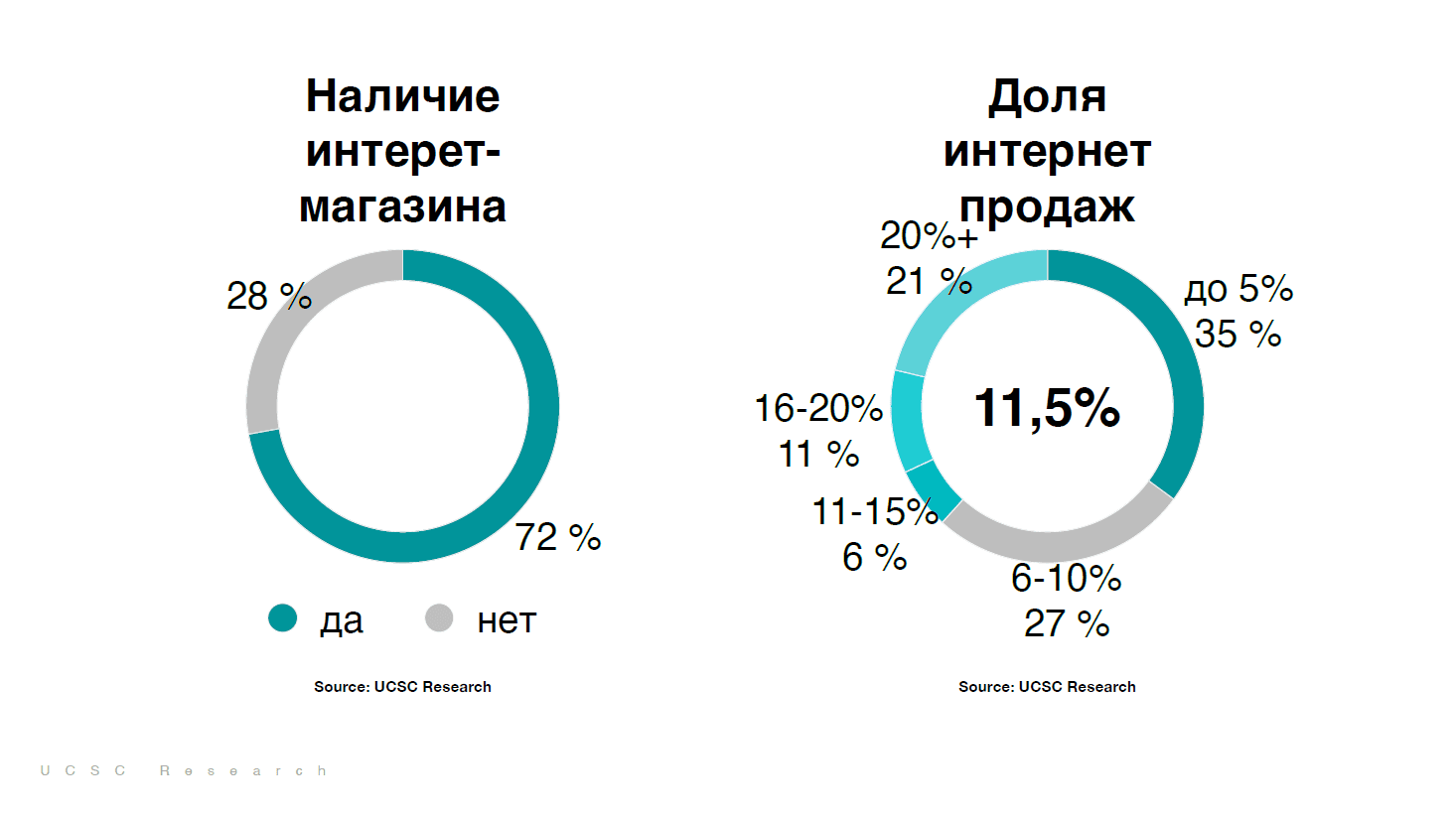 72% роздрібних компаній мають свої інтернет-магазини. Але частка продажів залишається невеликою – близько 11%. Більше третини опитаних мають мінімальну частку онлайн продажів – до 5% у загальному обсязі продажів в Україні.