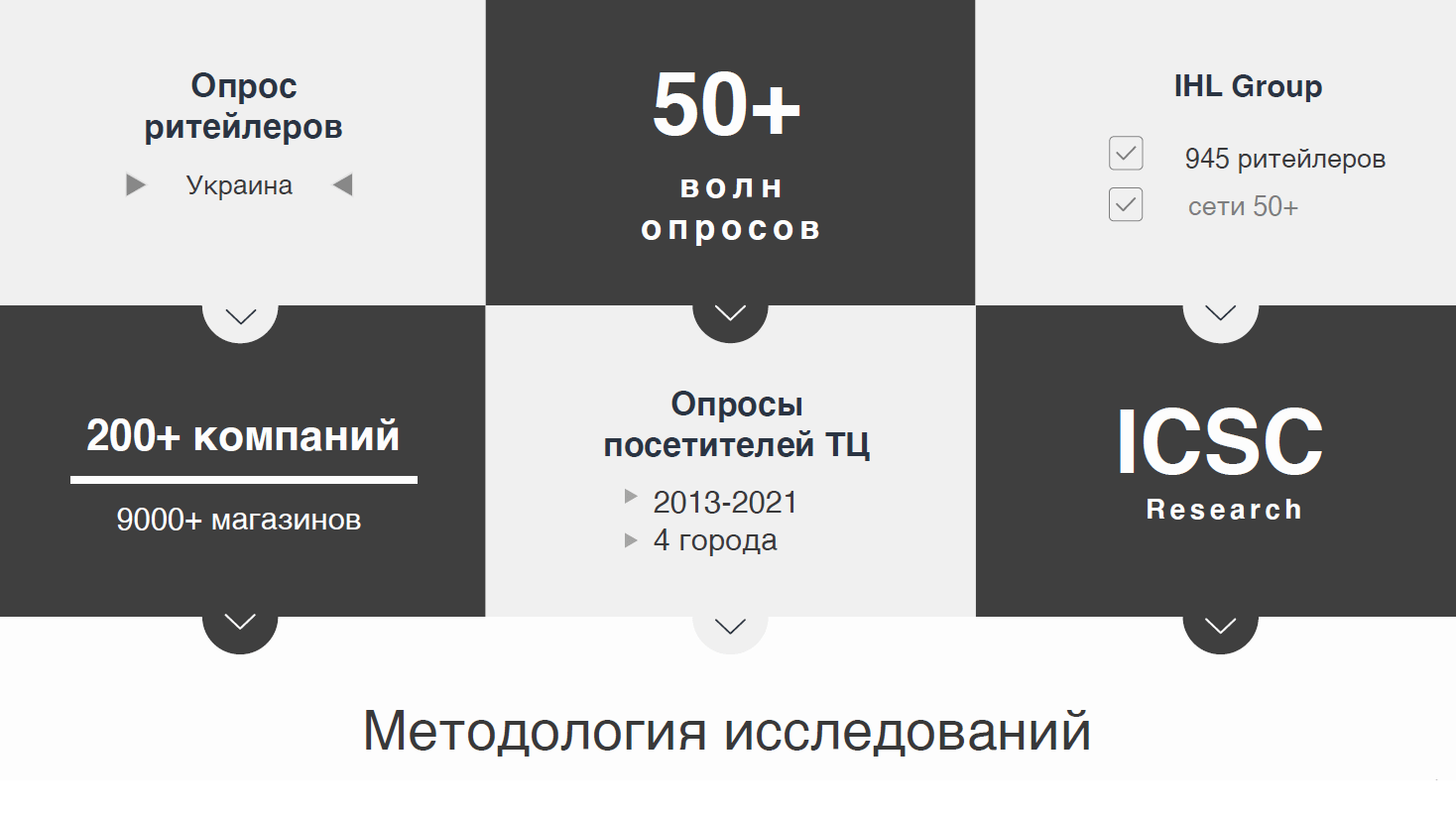 Ми провели опитування понад 200 українських ритейлерів, які представляють понад 9 000 магазинів. Крім того, було використано опитування відвідувачів наших торгових центрів. Також були задіяні дані міжнародних дослідницьких компаній, таких як Міжнародна Рада Торгових Центрів (ICSC) та IHL Group, які займаються професійно вивченням тенденцій на ринку.