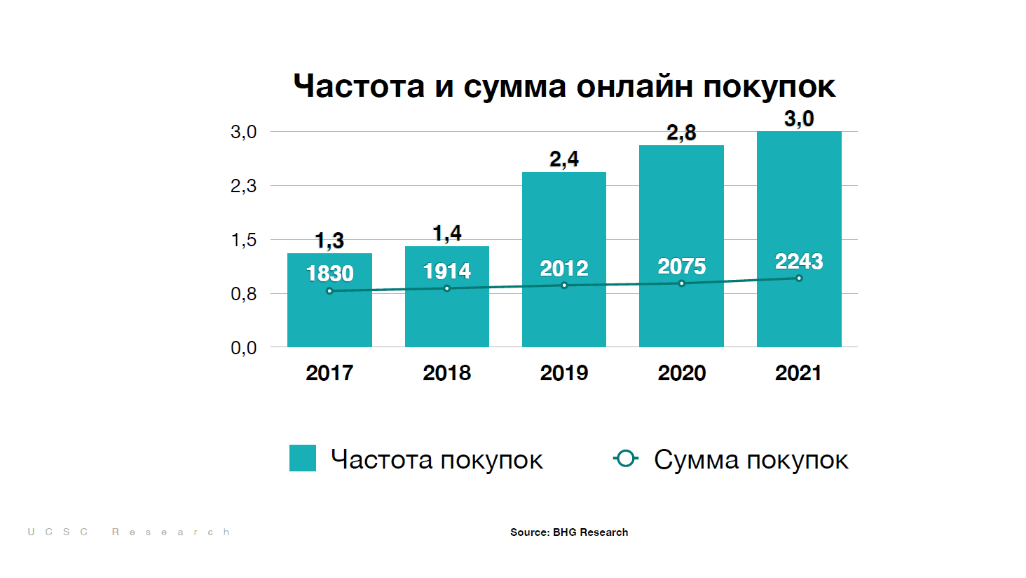 Завдяки даним опитувань відвідувачів наших торгових центрів у різних містах протягом кількох років можна простежити, як змінюється частота та сума покупок онлайн.