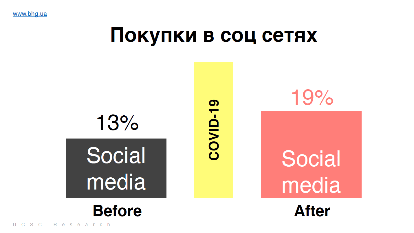 А ось що дійсно змінилося і що відчувається – це те, що спосіб покупки у соціальних мережах став цікавішим для наших відвідувачів. Якщо до пандемії він становив 13%, то після пандемії – 19%.