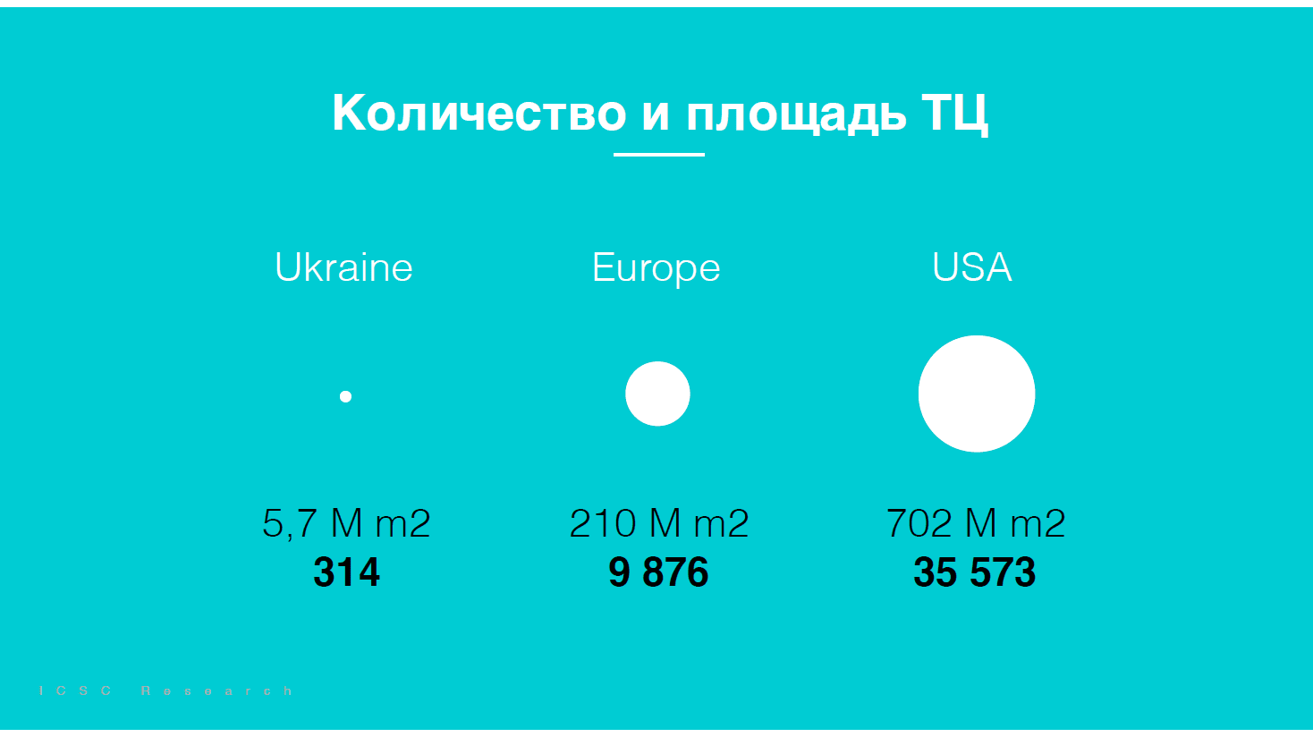 Для початку необхідно розібратися, що являє собою ринок США. Якщо в Україні працює трохи більше 300 торгових центрів, то у Сполучених Штатах – понад 35 000. Отже, насиченість ринку США у 20 разів вища, ніж в Україні. Для того, щоб Україні наздогнати США за насиченістю, за умови, що будуватимуться ТРЦ так само, як і в 2021, буде потрібно 300 (!) років.