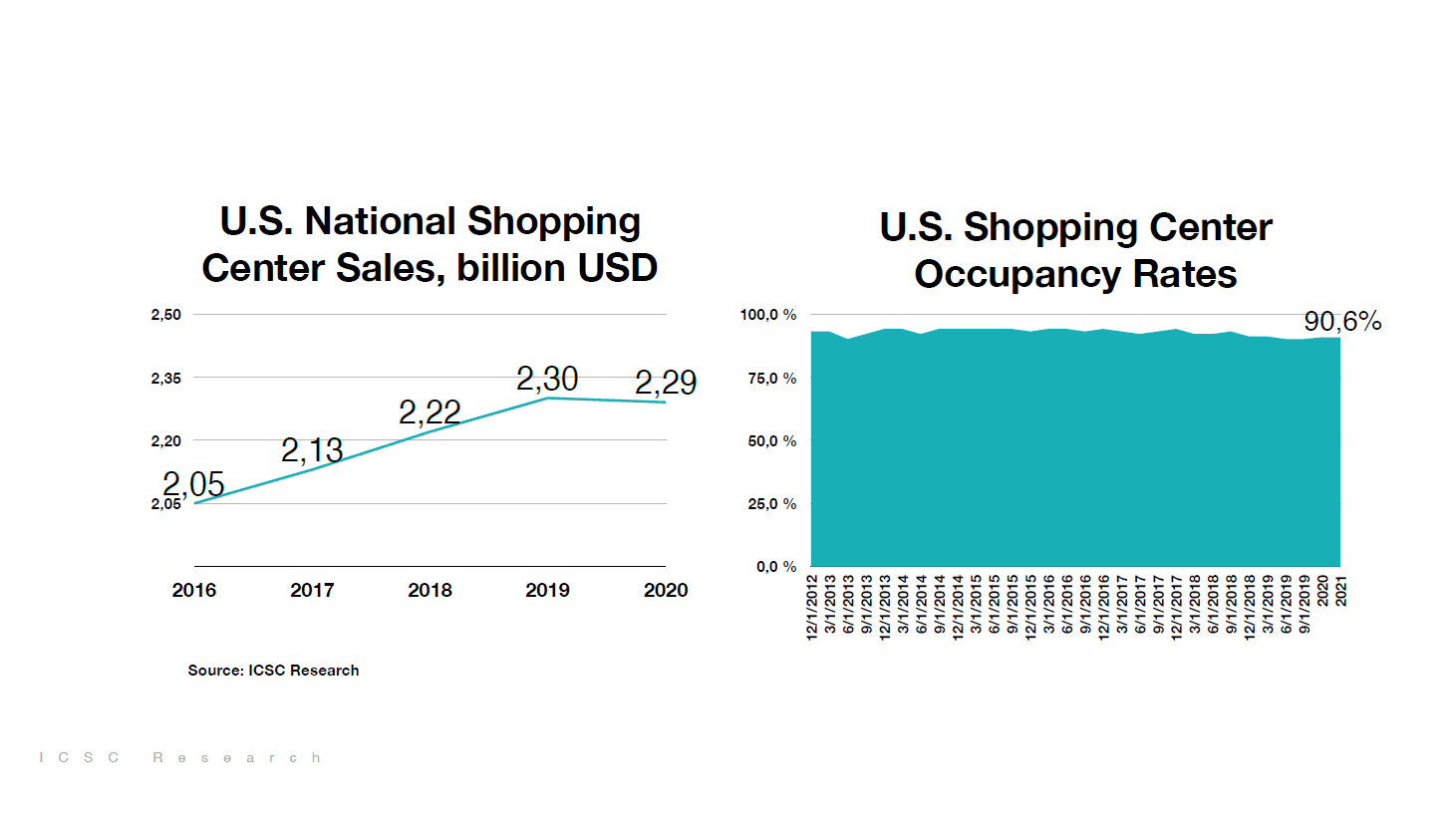 А діючі торгові центри у Штатах демонструють досить стабільні показники. У 2020 році оборот склав 2,2 трлн доларів – приблизно стільки ж, як і в 2019, незважаючи на всі локдауни. Заповнюваність також залишається стабільною – на рівні 90%.