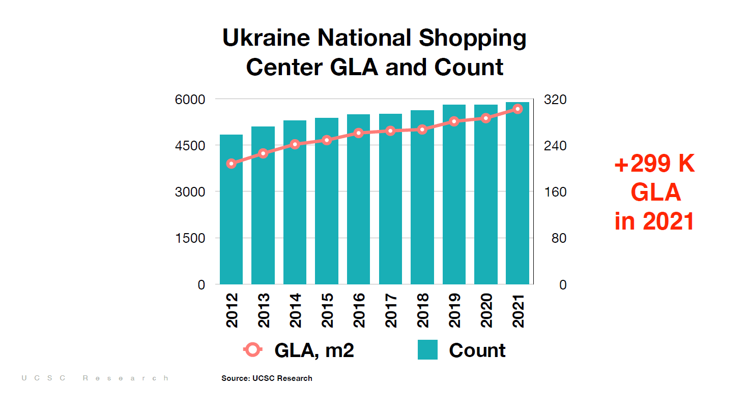 У 2021 році кількість торгових центрів у країні збільшилася на 5, додалося 300 тис. GLA.