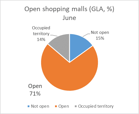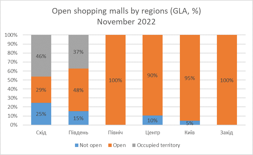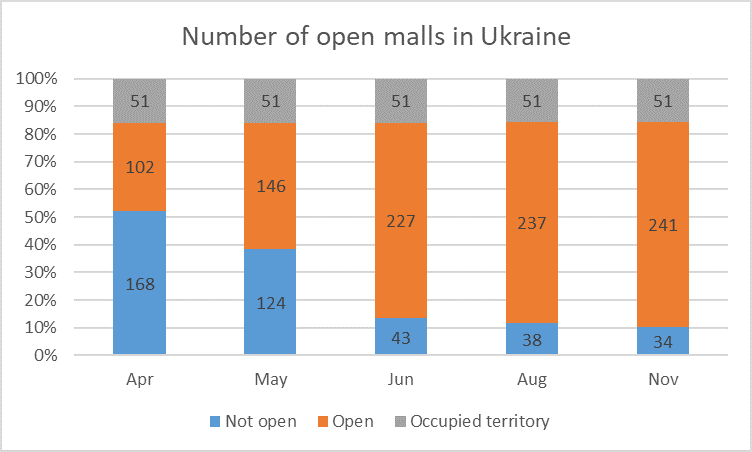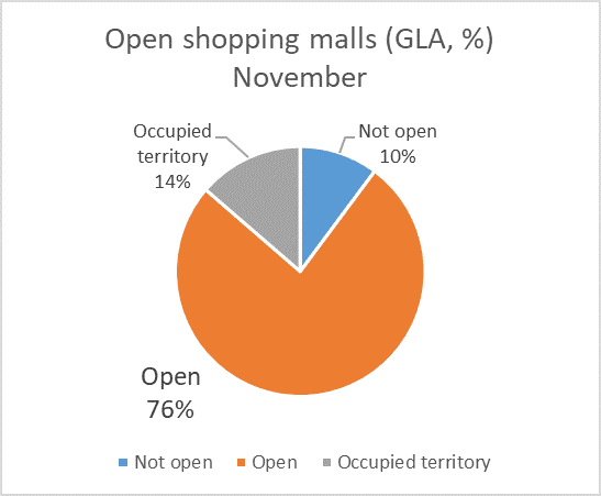 Це складає 76% всіх торгових площ з урахуванням ТЦ, що знаходяться на тимчасово окупованій території. Цей показник дещо виріс порівняно з початком літа, коли працювало 71% торгових площ. Не працюючими залишаються 10% торгових площ (590 тис. кв. м), більша частка з яких пошкоджено. Без урахування ТЦ на окупованій території, працюють на початок листопада 88% площ в ТЦ.