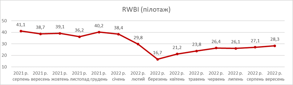 Ринок ТЦ в Україні незважаючи на те, що військові дії продовжуються, поступово відновлюється. Для моніторингу динаміки відновлення ринку Українська Рада Торгових Центрів започаткувала Індекс самопочуття торговельної нерухомості (RWBI). Як показує RWBI, після різкого падіння у лютому та березні, останні місяці спостерігається поступове відновлення основних показників роботи торговельних центрів — відвідуваності, орендних ставок, долі незанятих приміщень. Якщо у березні цього року Індекс становив 16,7, то у вересні вже 28,3. Довоєнний показник Індексу у вересні минулого року становив 38,7. Таким чином, згідно показникам Індексу ринок відновився вже приблизно на 70%.
