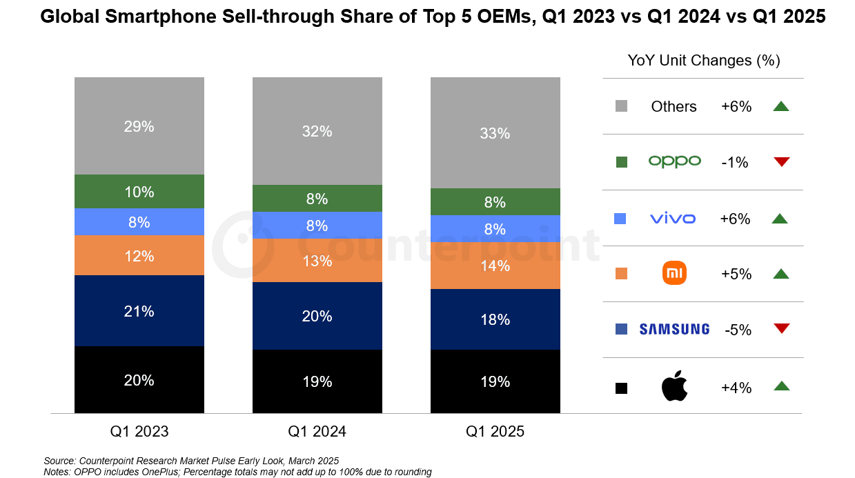 Друге місце у цьому рейтингу посідає Samsung з часткою ринку у 18%. Хоча компанія почала рік повільно, її продажі у березні показали відновлення після запуску флагманського S25 і нових пристроїв серії A.