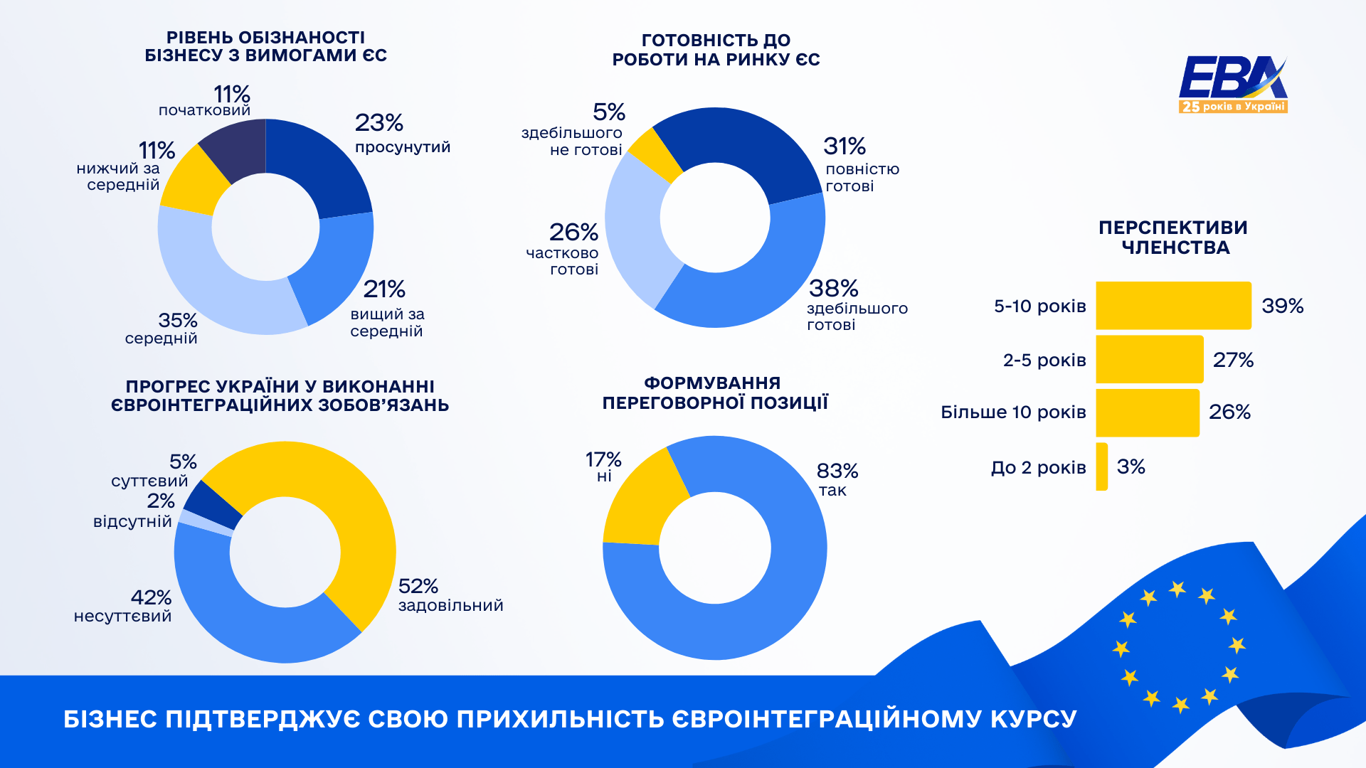 Більшість українських бізнесів готові до умов роботи на ринку Європейського Союзу. Про це свідчать результати опитування серед членських компаній Європейської Бізнес Асоціації.