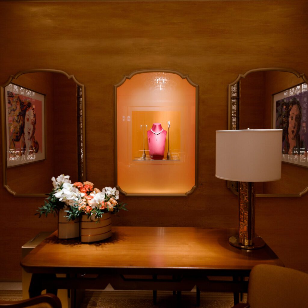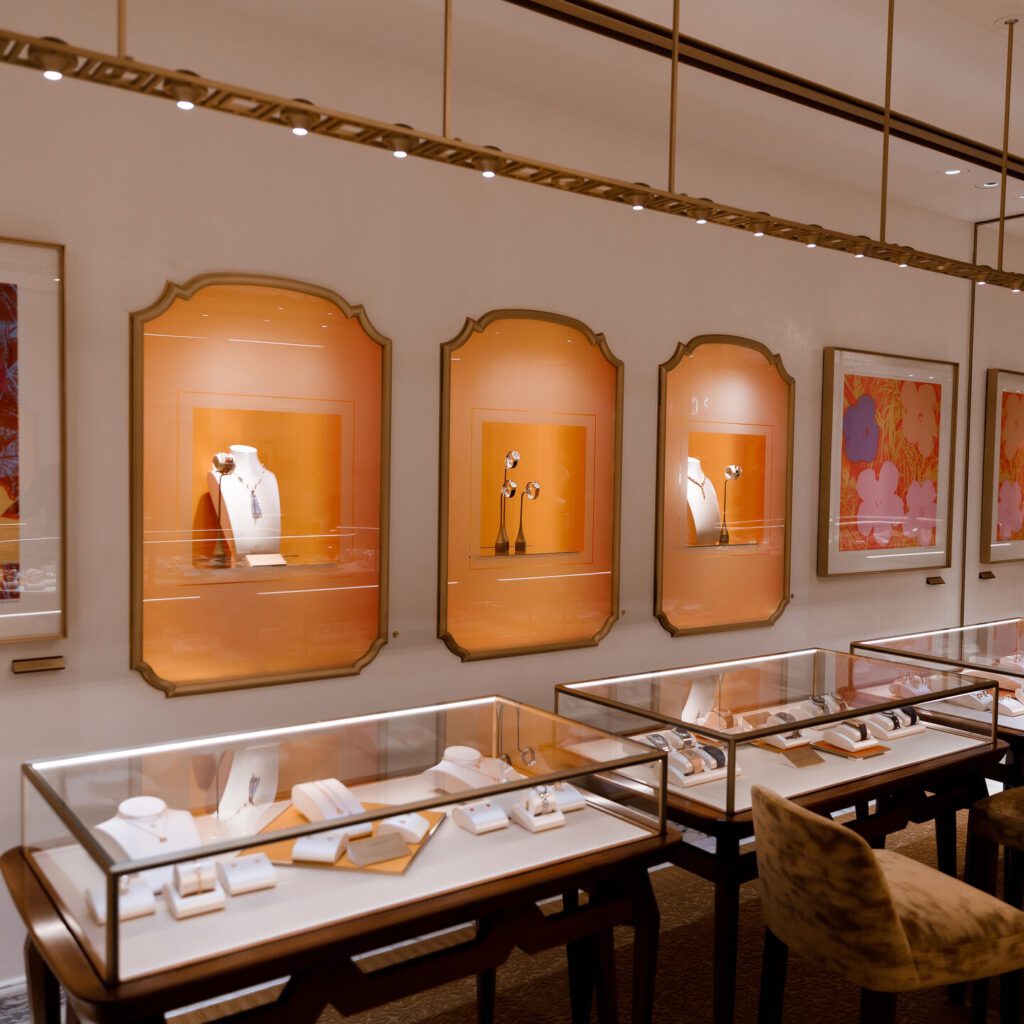 Римська спадщина проявляється у теплої атмосфері, а й у деталях. Наприклад, в інтер’єрі бутика використано багато мармуру, без якого неможливо уявити це місто, а бронзові грати з візерунком у вигляді діагональних ромбів – це вже відсилання до архівного ескізу брошки Bvlgari, яка так і не була випущена. Цей мотив можна побачити і в інших бутиках ювелірного Будинку.