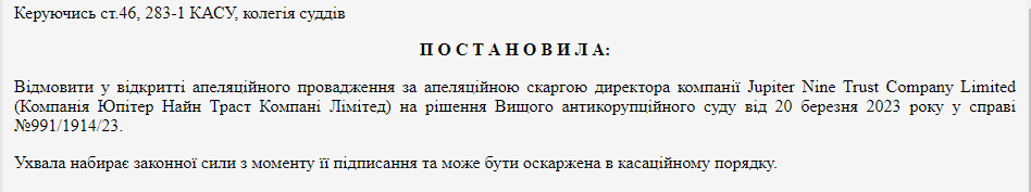У Єдиному судовому реєстрі зазначається, що колегія суддів Апеляційної палати ВАКС відмовила у відкритті апеляційного провадження в цій справі компанії Аркадія Ротенберга: