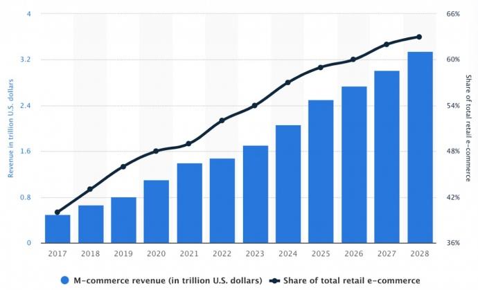 За даними Statista's Digital Market Insights, у 2023 році дохід від продажів через мобільну комерцію сягнув близько 1,7 трлн дол, що становить понад половину всіх роздрібних онлайн-продажів. Частка мобільної комерції постійно зростає: із 43% у 2018 році до прогнозованих 63% у 2028 році.