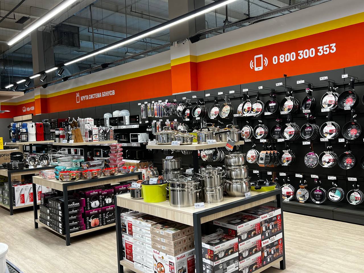 Загальна площа становить 1080 м кв., торгова – 800 м кв.. Це дозволило реалізувати загальноприйняту фірмову концепцію з оформлення торгового простору, наповнити магазин оптимальним асортиментом і залучити до організації бренд-зон партнерів від провідних виробників.