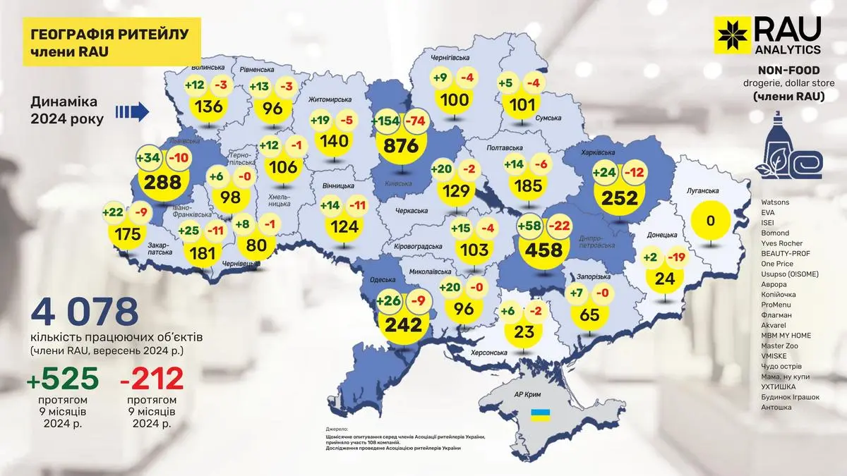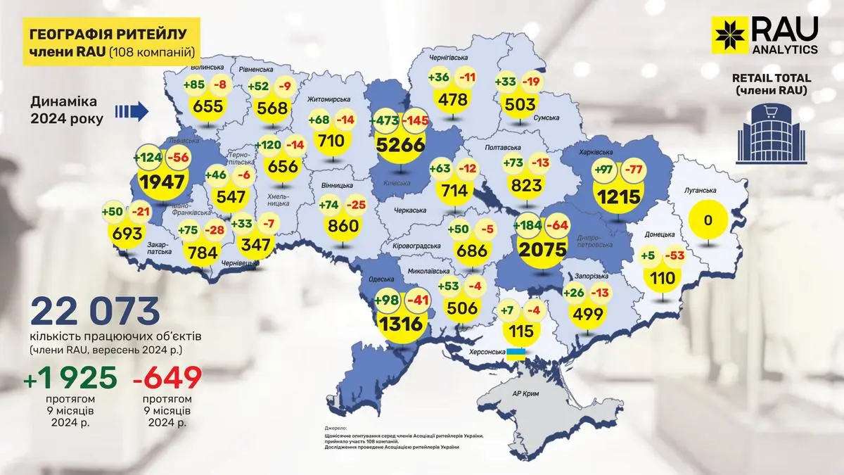 Відповідно за досліджуваний період чистий приріст склав 1276 торгових об’єктів, а за перші шість місяців 2024-го додалося 837 магазинів. Станом на вересень 2024 року працювало вже 22 073 торговельних точок у восьми основних галузях ритейлу.