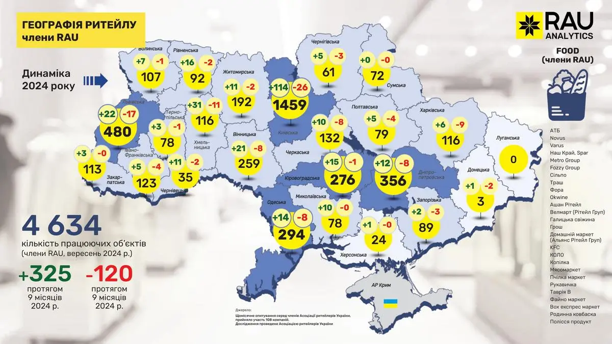 У вересні цього року в усіх областях України працювало 4634 магазини різного формату, за 9 місяців їхня кількість збільшилася на 205 точок, з урахуванням закриття 120 магазинів.