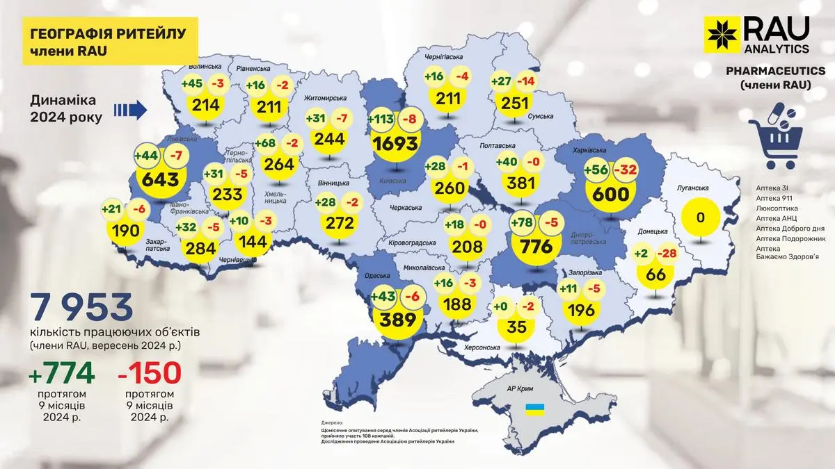 За 9 місяців 2024 року відкрилося 774 аптеки і це найвищий показник серед усіх сегментів ритейлу. Кількість закритих точок становить всього 150 закладів, тобто чистий приріст – 624 аптеки.
