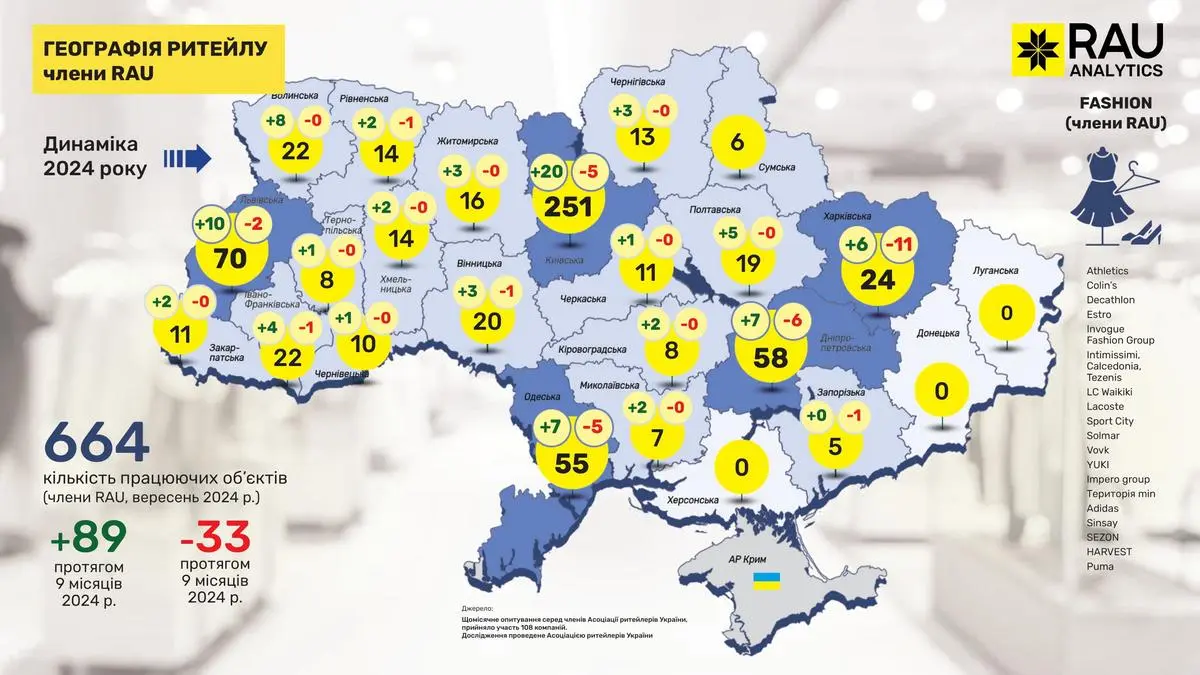 У більшості регіонів ситуація залишилася незмінною. Найбільша кількість магазинів зосереджена в Києві (251), Львові (70), Дніпрі (58) та Одесі (55). В п’ятірку входить ще Харківська область, але на відміну від інших, тут баланс відкритих/закритих магазинів є негативним. У Харківському регіоні зафіксовано найбільше закритих точок fashion-операторів – 11 магазинів.
