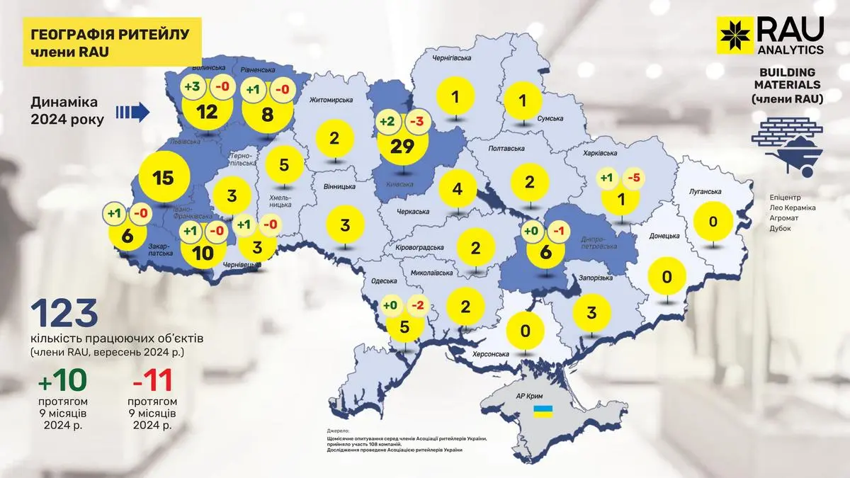 Основна частина торгівлі зосереджена у столичному регіоні – 29 магазинів, або чверть всіх торгових точок даної сфери. В трійку регіонів з найбільшою концентрацією будівельних магазинів також входить Львівська (15 точок) та Волинська (12) області.