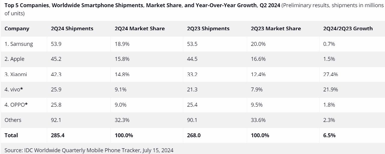 У другому кварталі Samsung зайняв лідируючу позицію з часткою поставок 18,9% завдяки стратегічному фокусу на своїх флагманах та сильній стратегії штучного інтелекту.