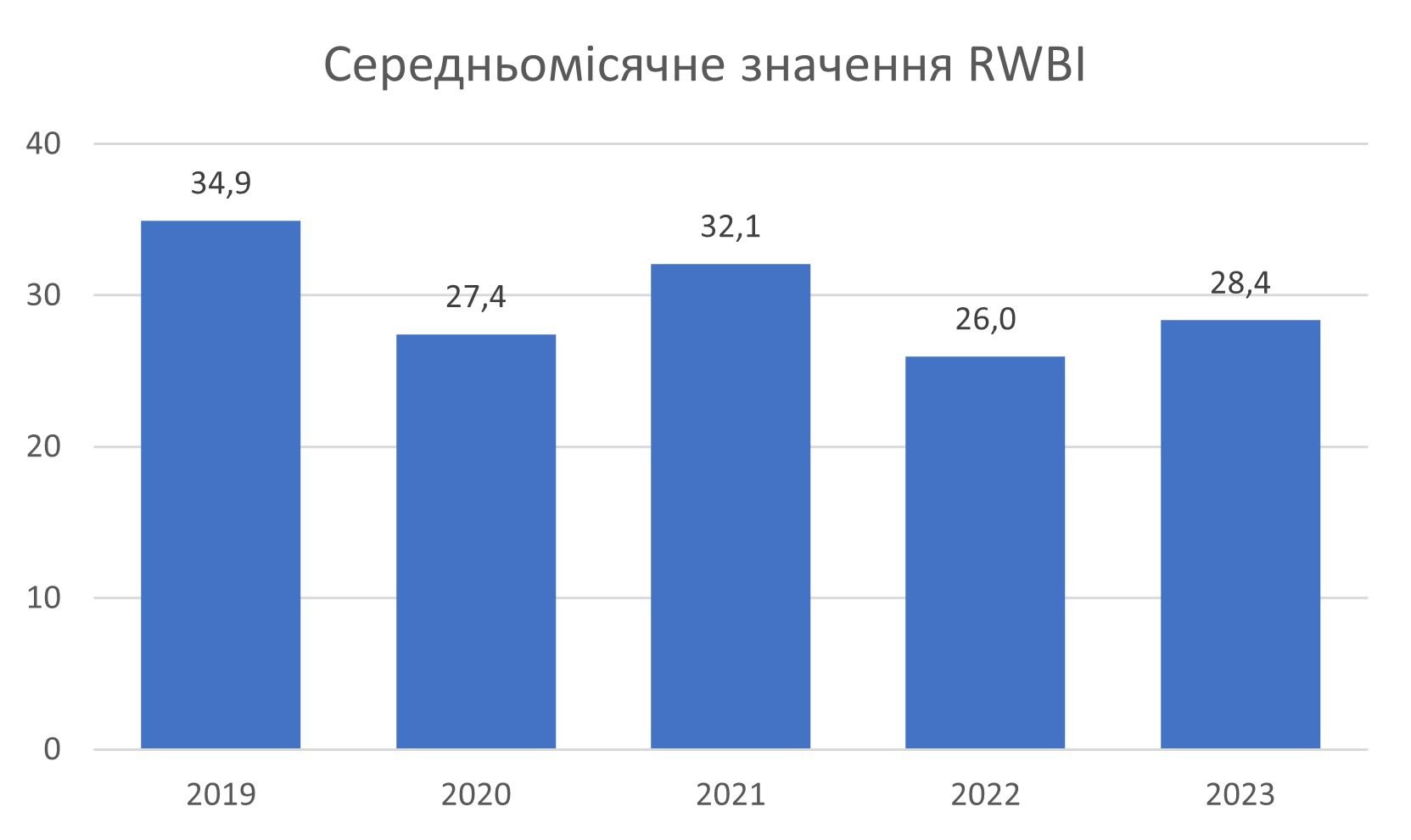 Аналіз свідчить про те, що найнижчий середньомісячний показник зафіксовано в 2022 році (26,0 пункти). В 2023 році відбувається поступове відновлення ринку, та середньомісячний показник 2023 року (28,4) перевищив значення Індексу КОВІДного 2020 р. (27,4 пункти).