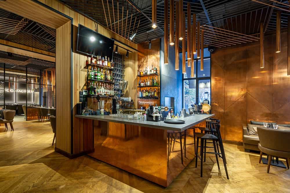 Основою дизайну закладу в Одесі стало поєднання холодного металу і теплого дерева з мідними листами. Кріейтори зробили акцент на мідні трубчасті лампи, які гармонійно поєднуються з мідним покриттям в інших деталях ресторану.