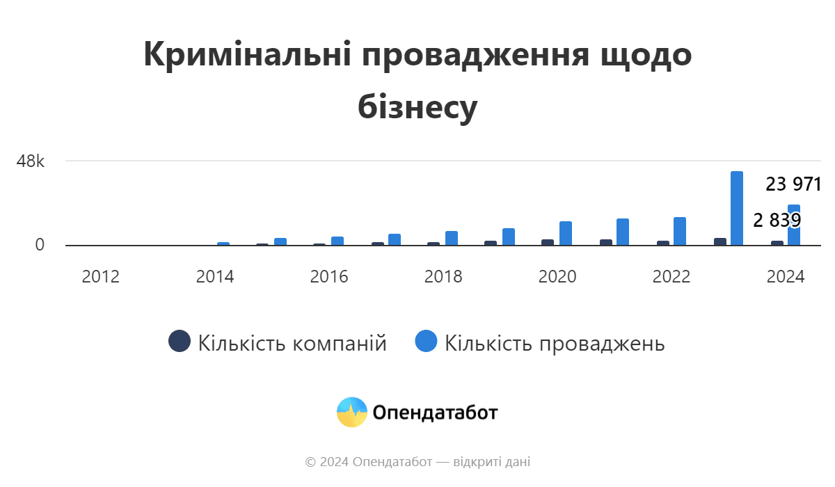 Таким чином 2023 рік загалом став рекордним за кількістю відкритих кримінальних проваджень проти бізнесу — 43 138 справ, зазначає платформа аналітики відкритих даних Опендатабот. Це найбільший показник з 2012 року.