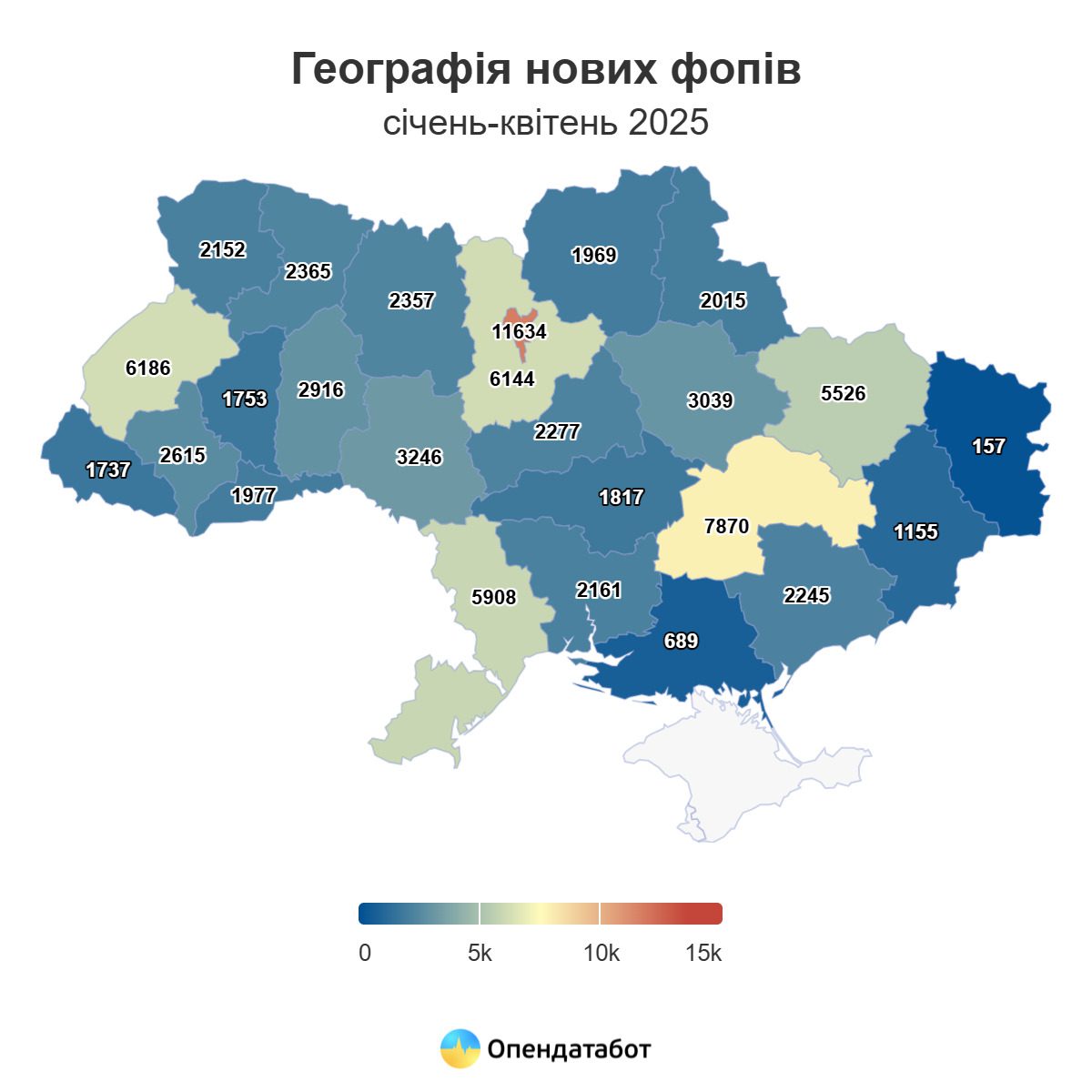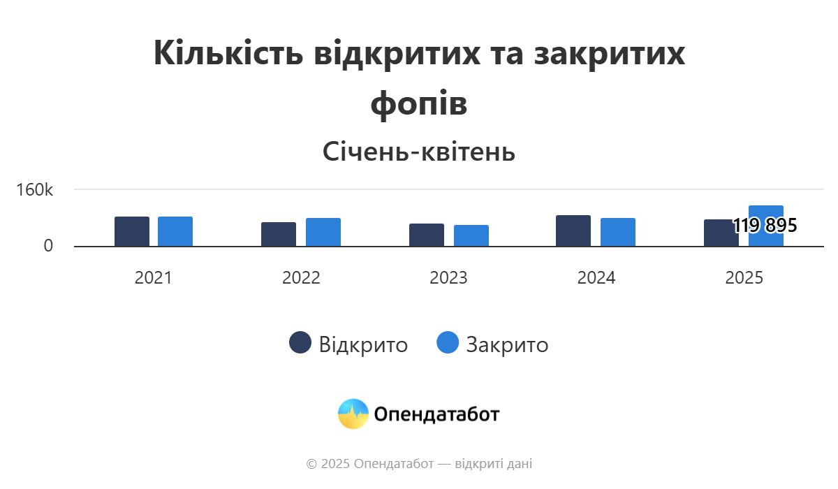 81 928 фопів відкрилось в Україні від початку 2025 року. Це на 9% менше, ніж за той самий період торік. Водночас 119 895 підприємців припинили свою діяльність цьогоріч. Закриттів побільшало на 44% порівняно з тим самим періодом 2024 року, - зазначається в аналітиці.