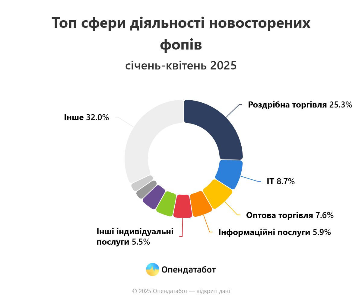 Зазначається, що минулоріч відкривалось більше малих бізнесів, ніж закривалось. Найпопулярніша галузь серед нових підприємців — роздрібна торгівля, на яку припадає майже чверть нових ФОПів, а саме 20 763 підприємці.