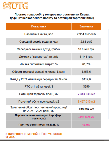 За розрахунками аналітиків, з урахуванням поточного рівня доходів населення платоспроможний попит здатний забезпечити успішне функціонування для 2 313 033 м кв торговельних площ, тоді як на січень 2025 вже функціонують 2 457 010 м кв.