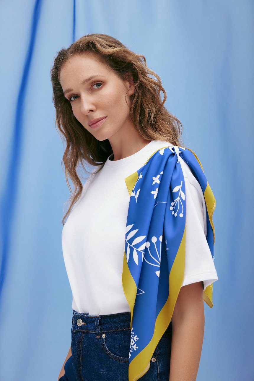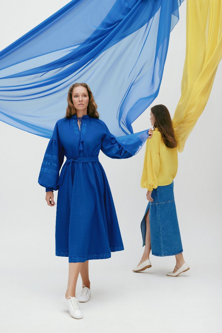 У лінійці представлені футболки, сорочки, топи, сукні, хустки з патріотичними принтами та символами.