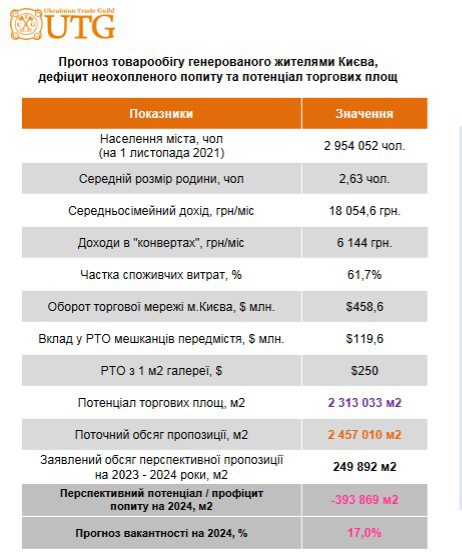 З урахуванням поточного рівня доходів населення платоспроможний попит здатний забезпечити успішне функціонування для 2 млн 313 тис. кв. м торговельних площ. У той час як на серпень 2023 року в Києві вже функціонують 2 млн 457 тис. кв. м. Запуск в експлуатацію до кінця 2024 року задекларованих проєктів загальною площею понад 250 тис. кв. м ще більше наблизить профіцит торговельних площ і стимулює поступовий перерозподіл споживчих потоків між об'єктами. Усе це приведе до зростання вакантності до 17% і корекції ставок оренди в бік зниження, - зазначив Костянтин Олійник.