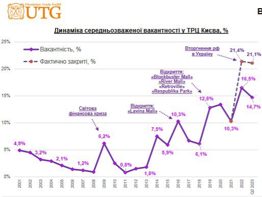 За даними дослідження UTG, рівень вакантності ТРЦ в Києві знизився з 16,5% на кінець 2022 до 14,7% на кінець першого півріччя цього року.