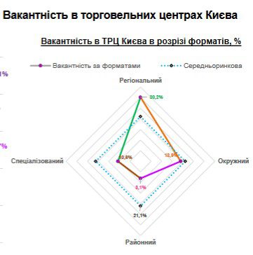 З урахуванням магазинів міжнародних брендів, які призупинили роботу в Україні, простоює 21,1% площ, до початку повномасштабної війни вільними були 10,3% площ.