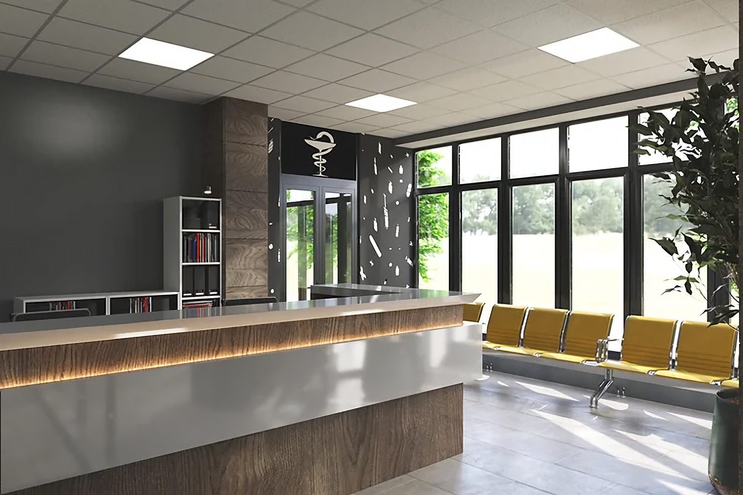 На першому поверсі лікарні передбачені рецепція, кабінети лікарів, аптека, кафе та допоміжні приміщення для маленьких пацієнтів.