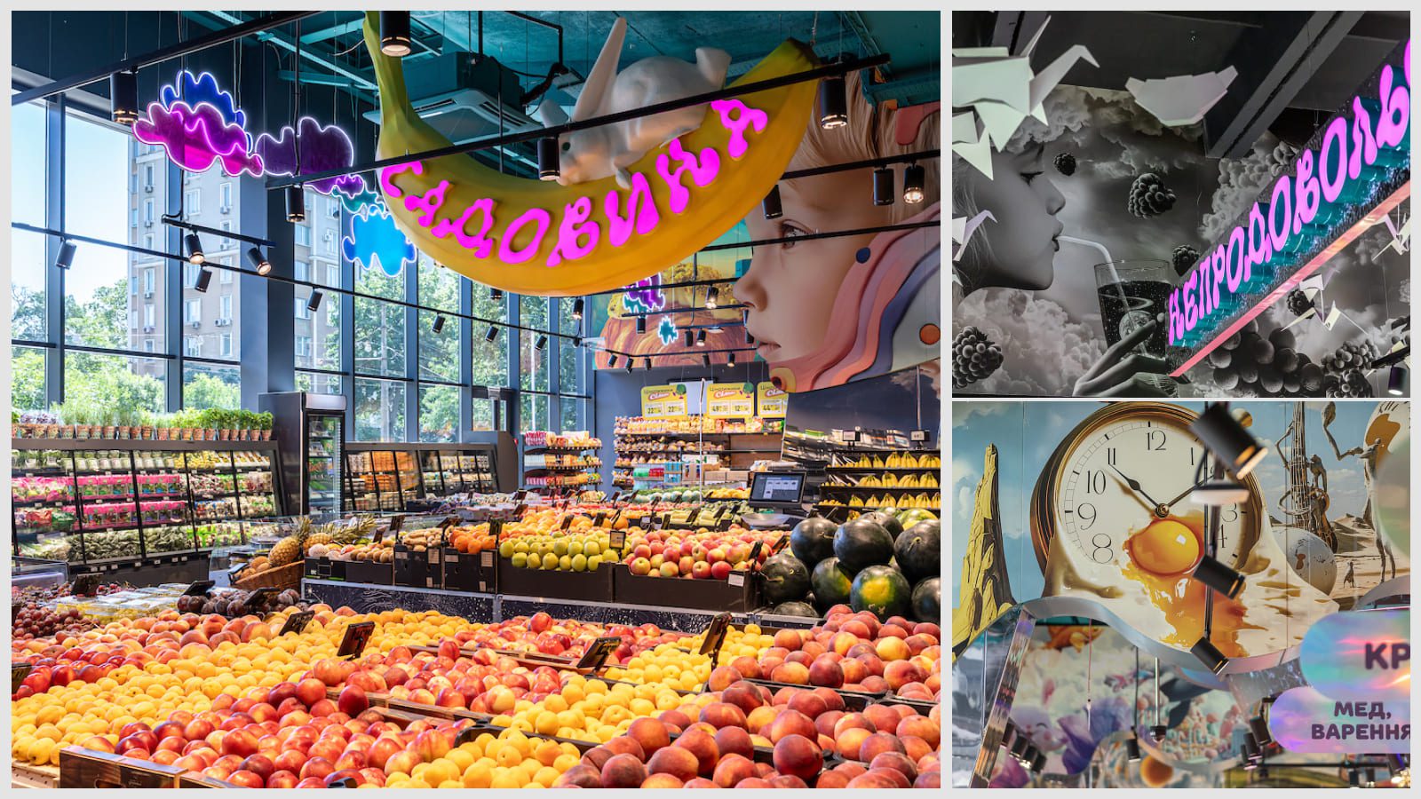 Дизайн поєднує у собі сюрреалізм і фентезі. Барвисті та чіткі елементи чергуються з розмитими та химерними образами — це допомагає передати відчуття сновидінь та підсвідомих символів. У просторі нового магазину нічого не є буквальною репрезентацією - усе заграє з метафорами: дзеркальний фасад — вхід у сон, зайчик на банані — абсурдна нічна алюзія, а каси з овечками — зона пробудження, - йдеться у повідомленні.