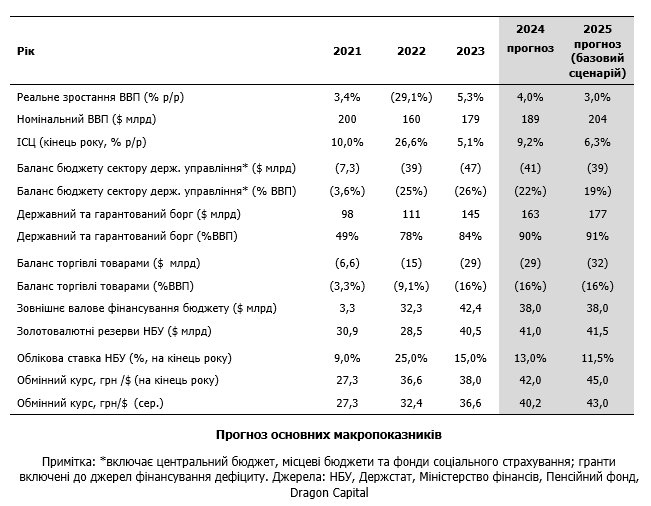 Дефіцит бюджету залишиться значним, близько 19% ВВП, завдяки пакету на $50 млрд від G7 структура його фінансування суттєво зміститься на користь безповоротних коштів. Це сприятиме стабілізації показника борг/ВВП на рівні близько 91% після трьох років зростання, сказано у макропрогнозі.