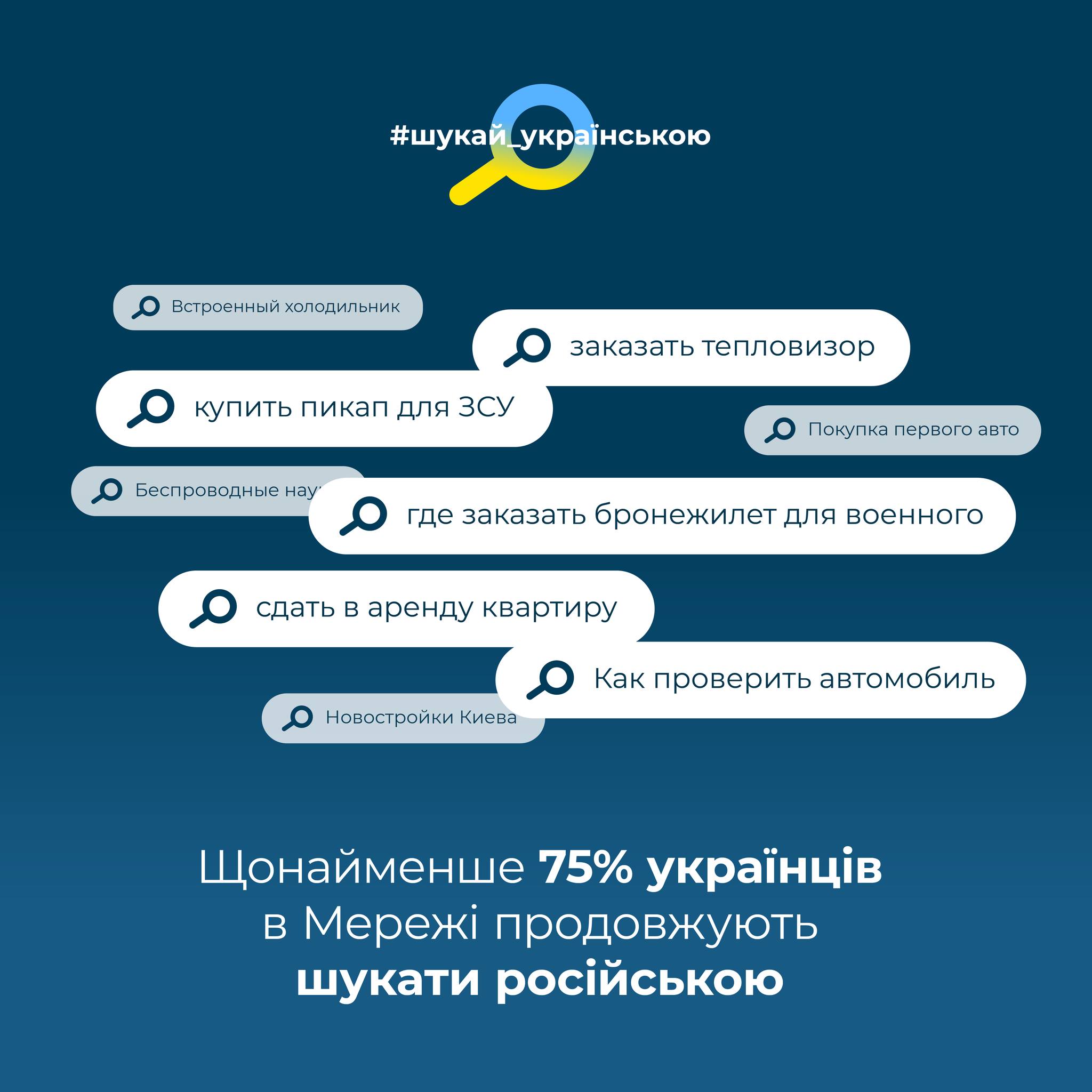 За результатами дослідження Gradus Research, 61% опитаних громадян спілкуються в побуті українською. Згідно з даними маркетплейсів, українці під час пошуку в інтернеті товарів чи послуг продовжують "гуглити" російською. Наприклад, із запитів на автомобільну тематику у пошукових системах лише 25% є україномовними.
