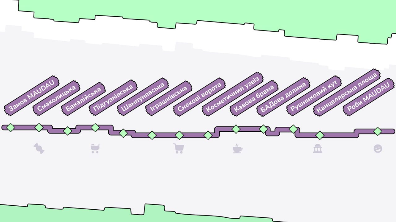 Поїзд рушає зі станції “Замов MAUDAU” — бо саме так починаються всі найкращі подорожі. Далі — коротка зупинка на станції “Смаколицькій”, щоб запастися смачненьким у дорогу. На “Бакалійській”, “Підгузівській” та “Шампунявській” наповнюємо кошики всім, що потрібно вдома. Підфарбовуємо настрій на “Косметичному узвозі”, набираємо обертів на “Кавовій брамі”, потім їдемо через “Рушниковий кут” — бо приємно знати, що вдома все м’яке й затишне.