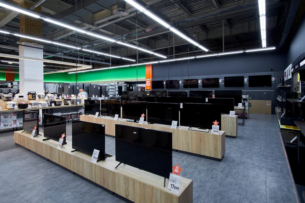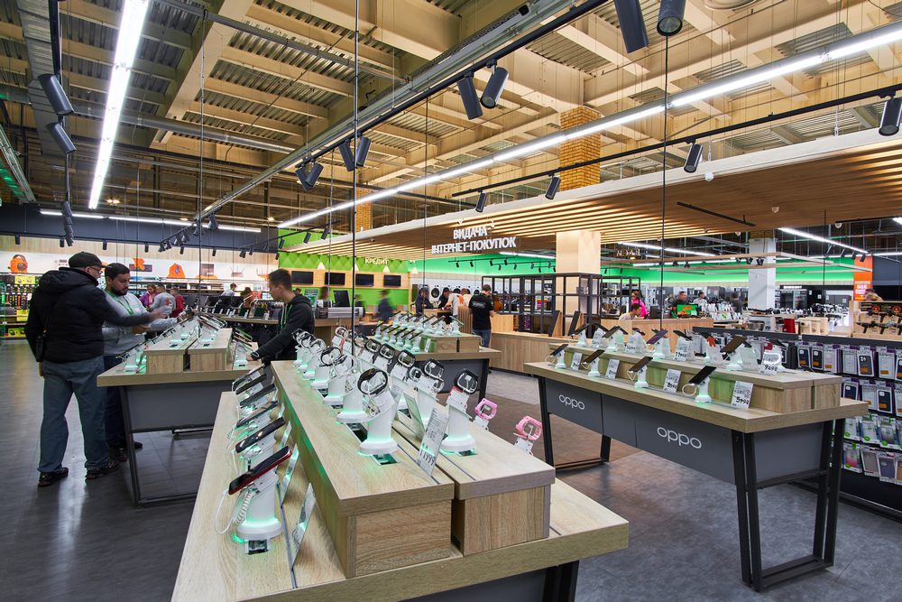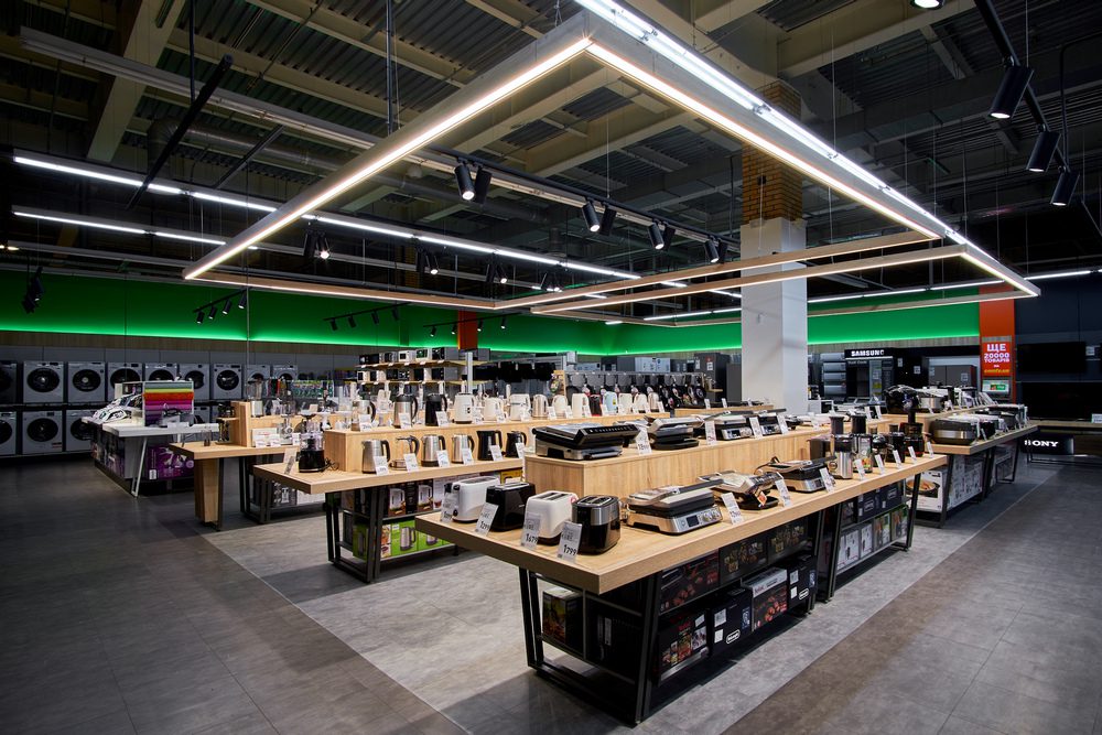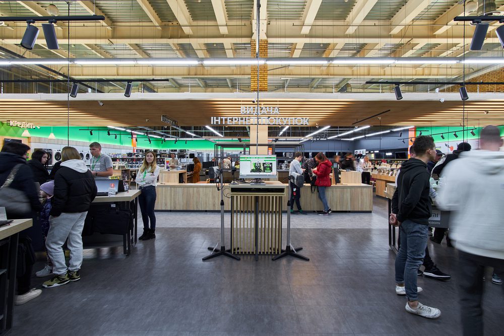 - традиційно для формату магазинів ритейлера присутні демонстраційні зони побутових та кухонних товарів та бренд-зони від Apple, Samsung, Braun, Sony, Karcher та Tefal.
