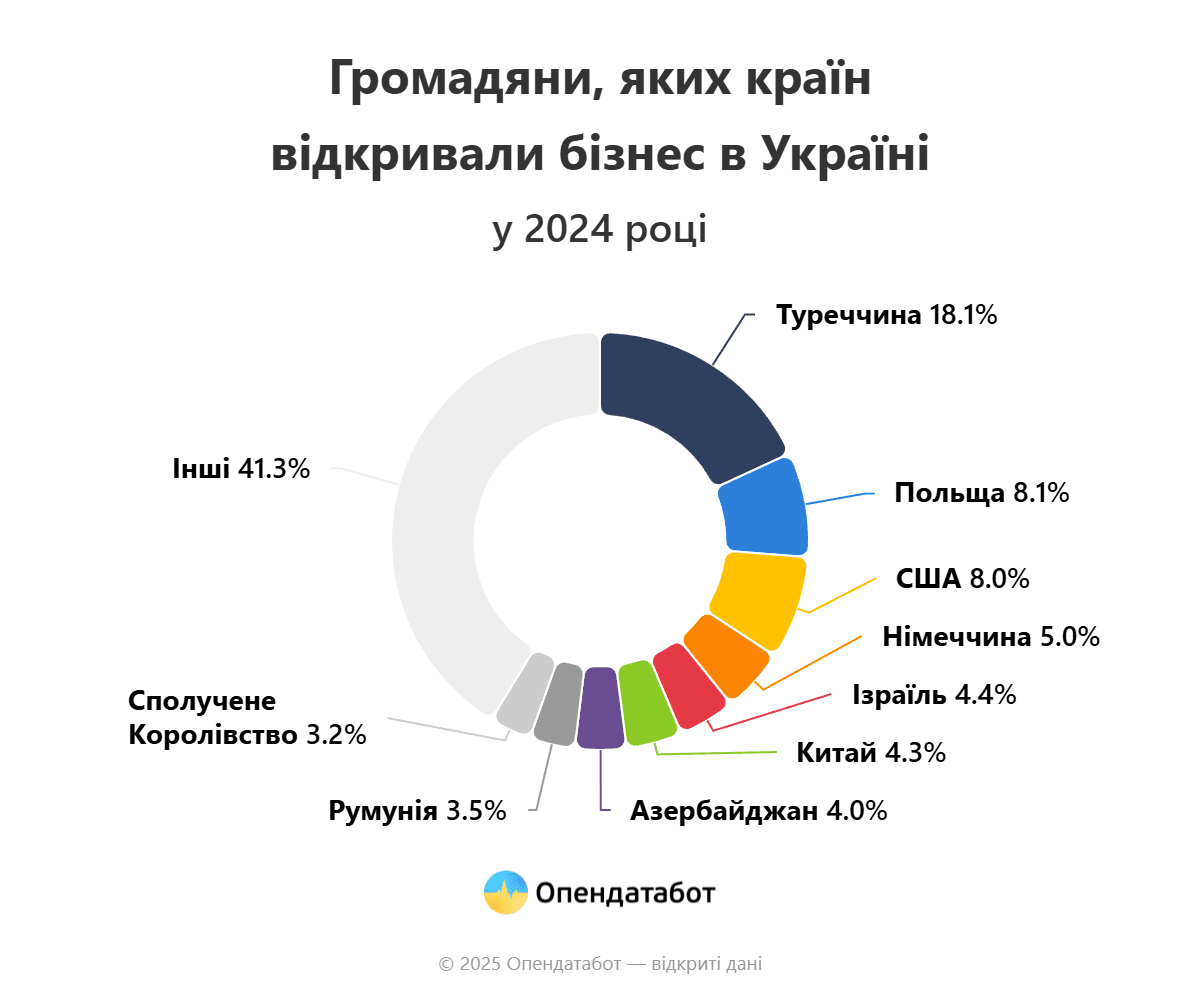 Минулого року представники 78 країн світу вирішили інвестувати в українську економіку, зареєструвавши нові компанії. Найактивнішими серед них були громадяни Туреччини, які відкрили 201 бізнес.  За ними слідували підприємці з Польщі —  90 компаній та США — 89.