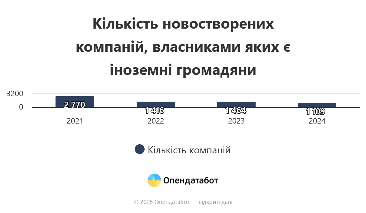 В Україні у 2024 році було зареєстровано понад 1,1 тисячу нових компаній, засновниками яких є іноземні громадяни, що на 24,2% менше порівняно з 2023 роком.