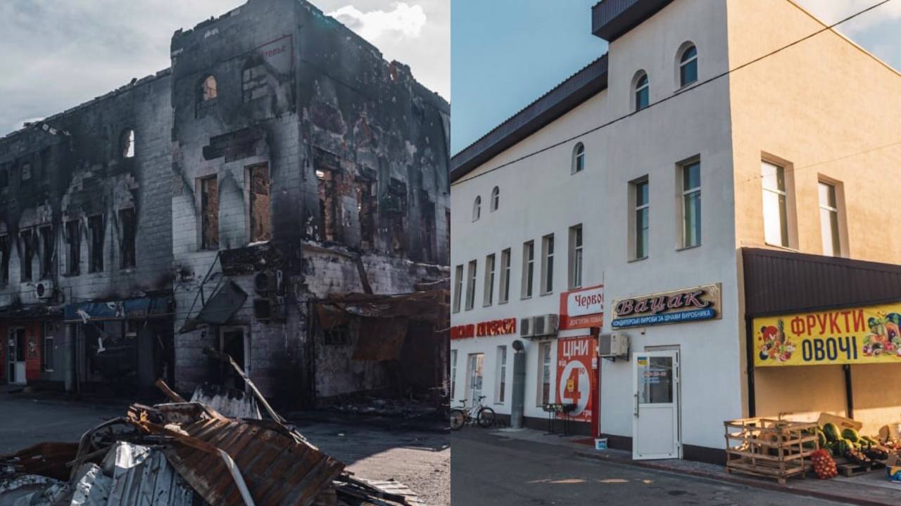 Відновленням займався власник: повністю відновив фасад та дах, встановив вікна та двері. Наразі торговий центр уже відновив роботу.