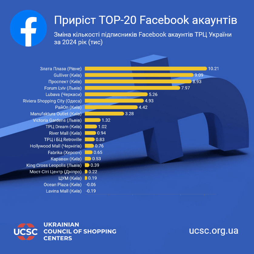 У Facebook найбільший приріст аудиторії (+10,2 тисяч за рік) у ТРЦ "Злата Плаза" (Рівне), далі йдуть столичні Gulliver (+9,09 тисячі за рік) та "Проспект" (8,93 тисячі за рік), львівський Forum Lviv (7,98 тисяч за рік) та Lubava (Черкаси) (+5,26 тисяч за рік).