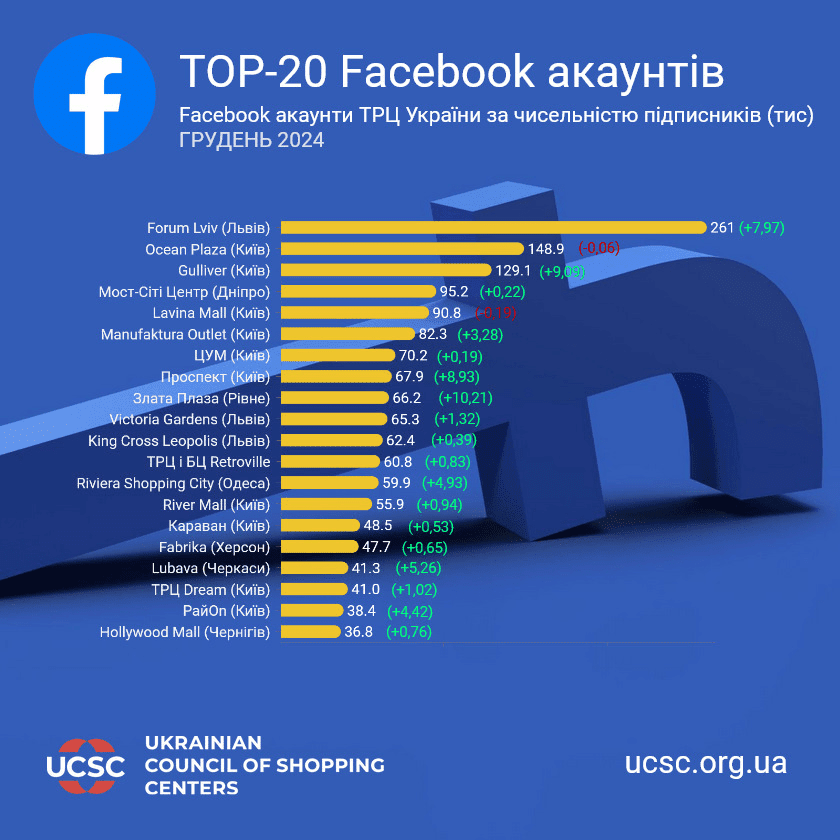 Українська Рада Торгових Центрів проаналізувала сторінки українських ТРЦ у соціальних мережах Facebook та Instagram, і представляє рейтинги з ТОП-20 акаунтів за кількістю підписників, за підсумками 2024 року.