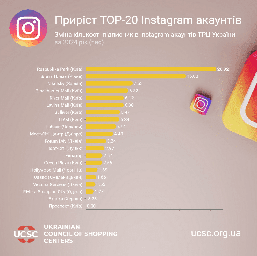 У Instagram темпи приросту ще більш вражаючі, на першому місці із понад 20 тисячами нових підписників ТРЦ Respublika Park (Київ). Другою йде рівненська “Злата Плаза”, що набрала трохи більше 16 тисяч нових шанувальників, а замикає трійку харківський ТРЦ Nikolsky із 7,53 тис. підписників.