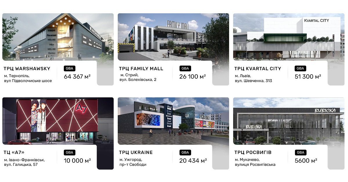 На сьогодні на різних стадіях реалізації на заході країни перебувають одразу 6 проєктів нових торговельно-розважальних центрів сумарною площею понад 180 000 кв. м.