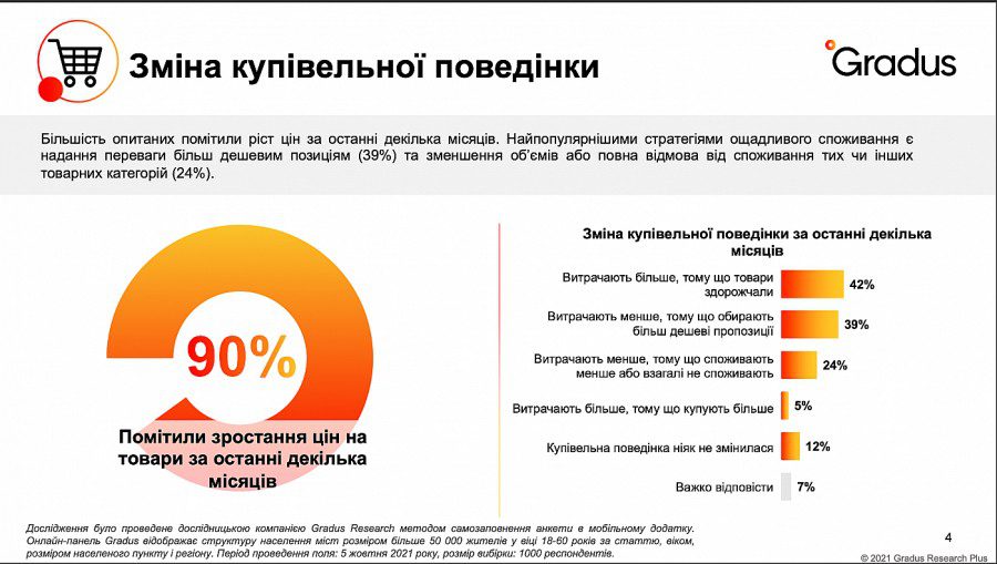 Незважаючи на стабільність гривні, міське населення України переймається швидким зростанням цін. Більшість опитаних помітили зростання цін протягом останніх кількох місяців. Постійні кризи і так привчили українців до ощадливості, проте зараз ми спостерігаємо довгострокові стратегії заощаджень та економії. Широко поширюється стратегія ощадливого споживання, як перевага дешевшим позиціям (39%) та зменшення обсягів або повна відмова від споживання тих чи інших товарних категорій (24%).