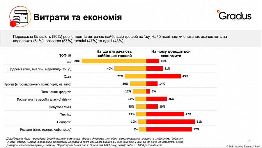 Переважна більшість (80%) респондентів більше грошей витрачає на їжу та ліки. Саме на ці дві товарні категорії українці витрачають найбільші бюджети. І саме на них заощаджують менше. У зону економії потрапили такі категорії, як одяг (на ньому економлять 43% опитаних), техніка, подорожі та розваги (від 47% до 61%).