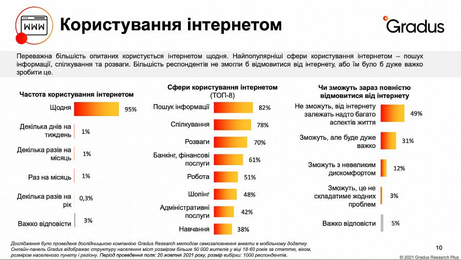 У Gradus Research також провели дослідження, наскільки інтернет став незамінною складовою життя українських городян. Щодня інтернет використовують 95% міського населення України віком 18-60 років. При цьому інтенсивність споживання висока у різних сферах. Насамперед, це пошук інформації та спілкування. Однак також високими є показники застосування інтернету для розваг, роботи, фінансових операцій та шопінгу. Половина респондентів вважають, що не здатні повністю відмовитися від інтернету, адже від мережі залежить багато сфер їхнього життя. Ще третина зможе, проте це буде тяжко.